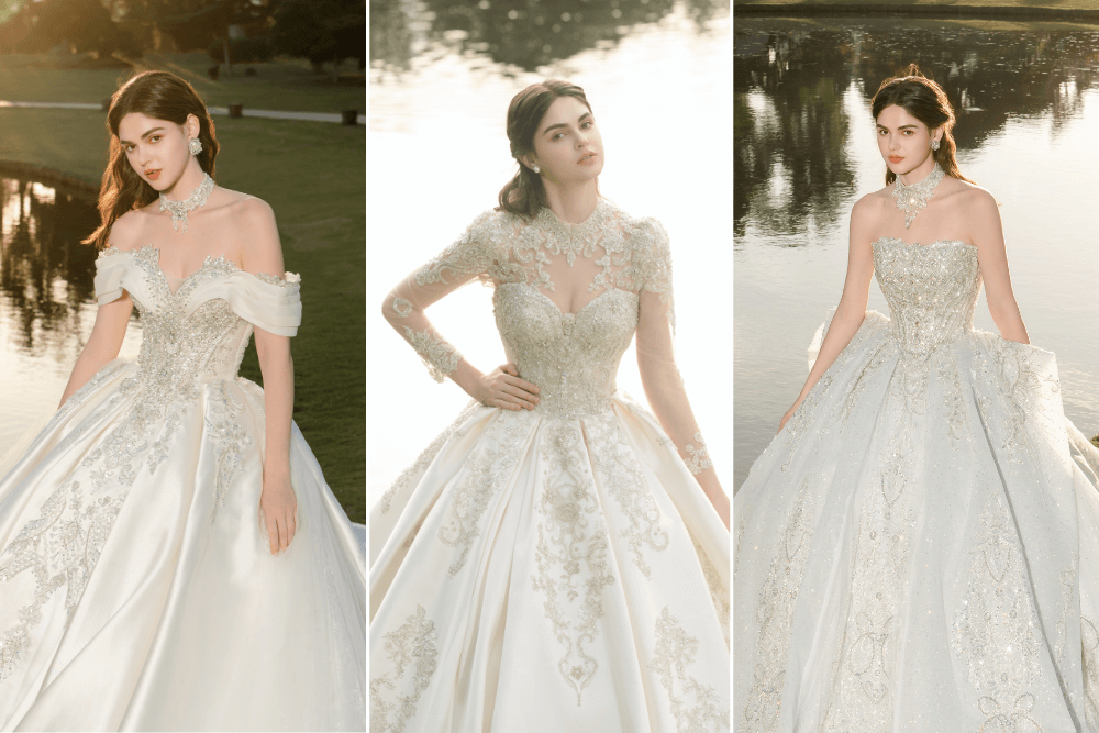 ❤️手臂修飾建議: 沙漏型新娘的曲線優勢明顯,可嘗試透膚蕾絲長袖、鐘形袖或垂墜袖,既能修飾手臂,又不失性感和優雅。