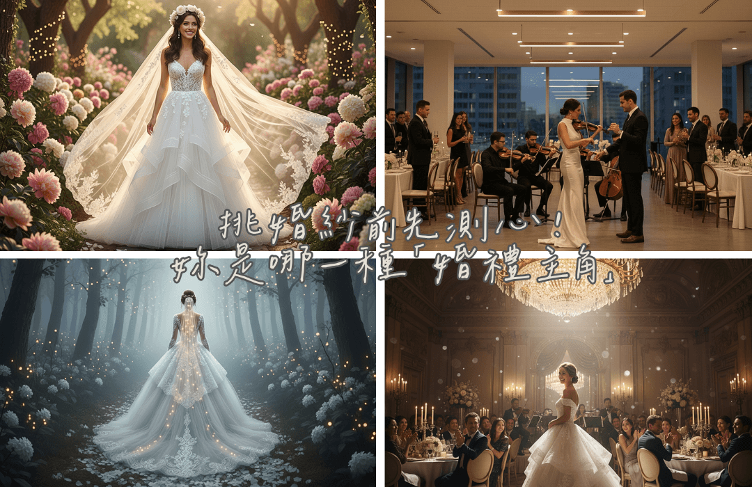 挑婚紗前先測心!妳是哪一種「婚禮主角系」?10 秒心理測驗,找出妳的婚紗靈魂屬性。