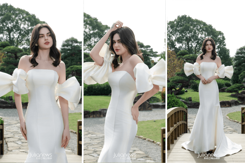 簡約剪裁+乾淨輪廓最能凸顯絲綢質感,搭配自然妝感與極簡花束更顯氣場。
