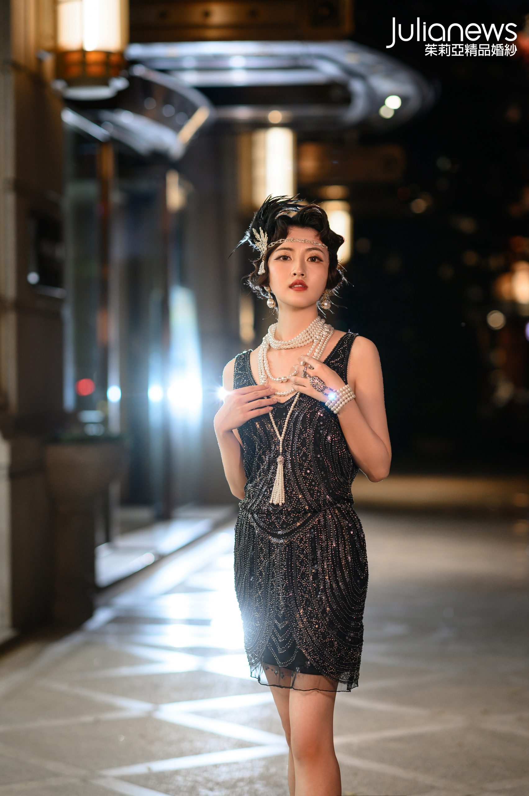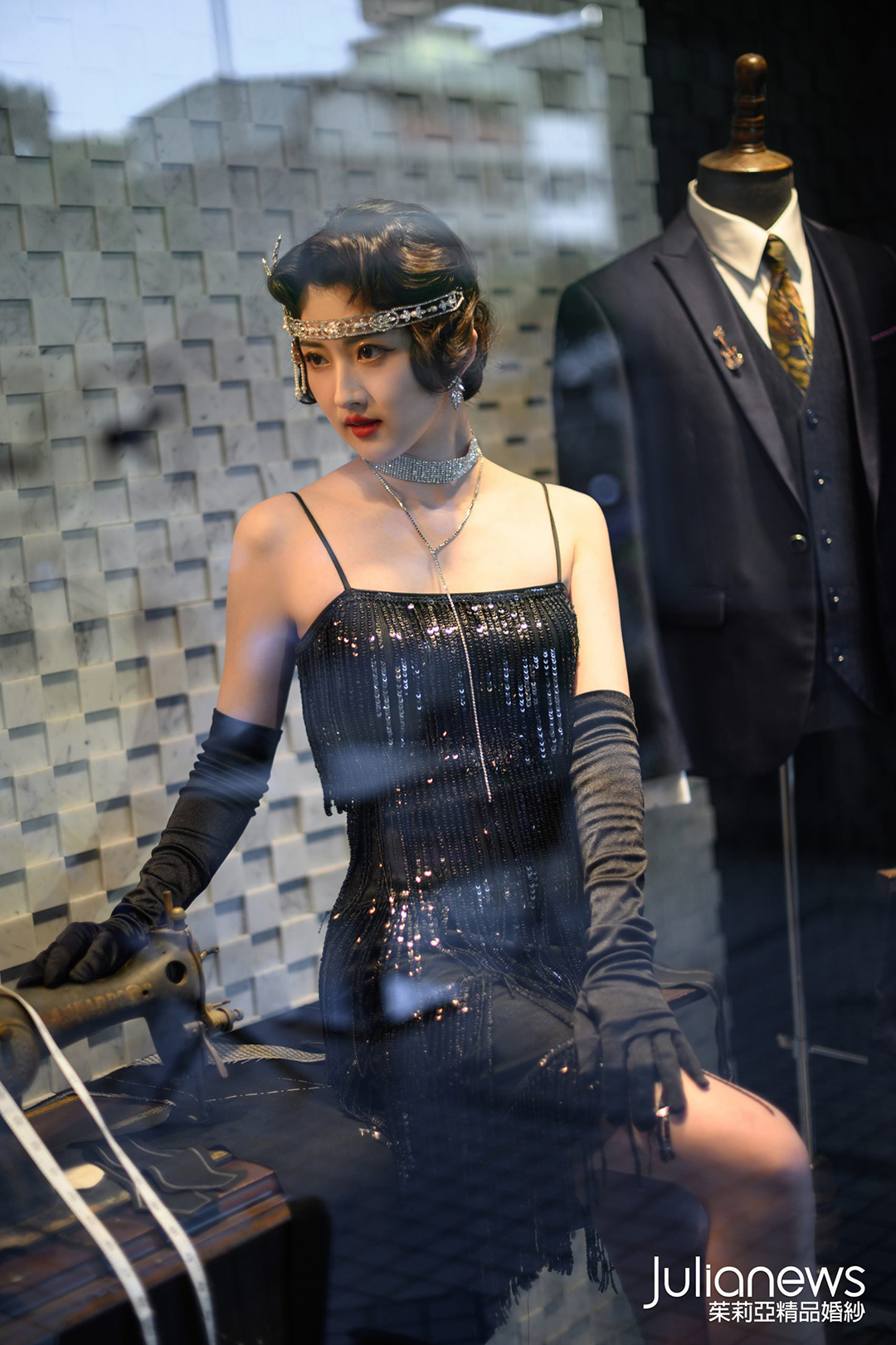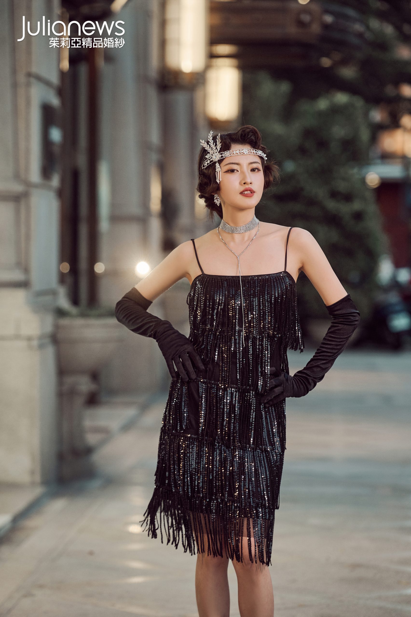 面料復古而高貴,深V領設計靈動而甜美,禮服版型修飾腿部線條,裙擺長度不多不少的描述著那一抹優雅與嫵媚,上身星星串珠點綴宛若星空,細節成就完美。