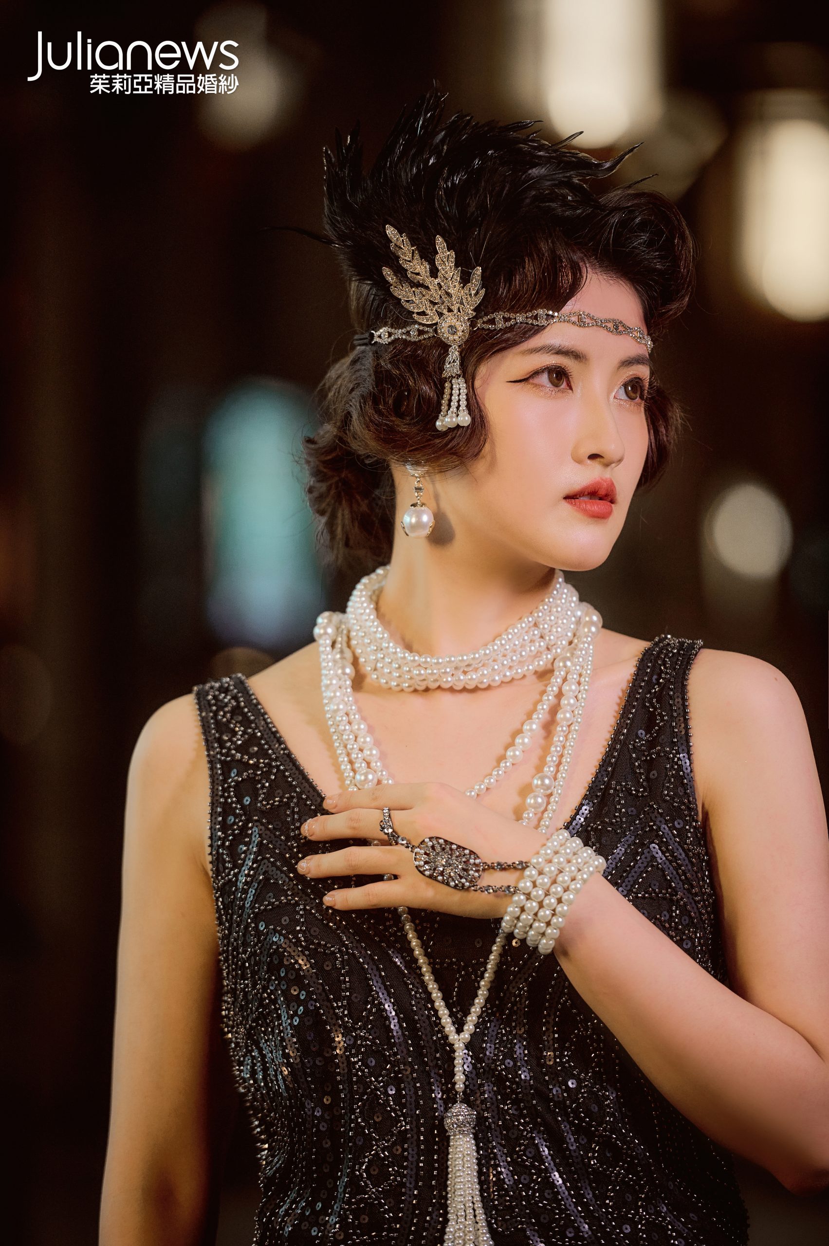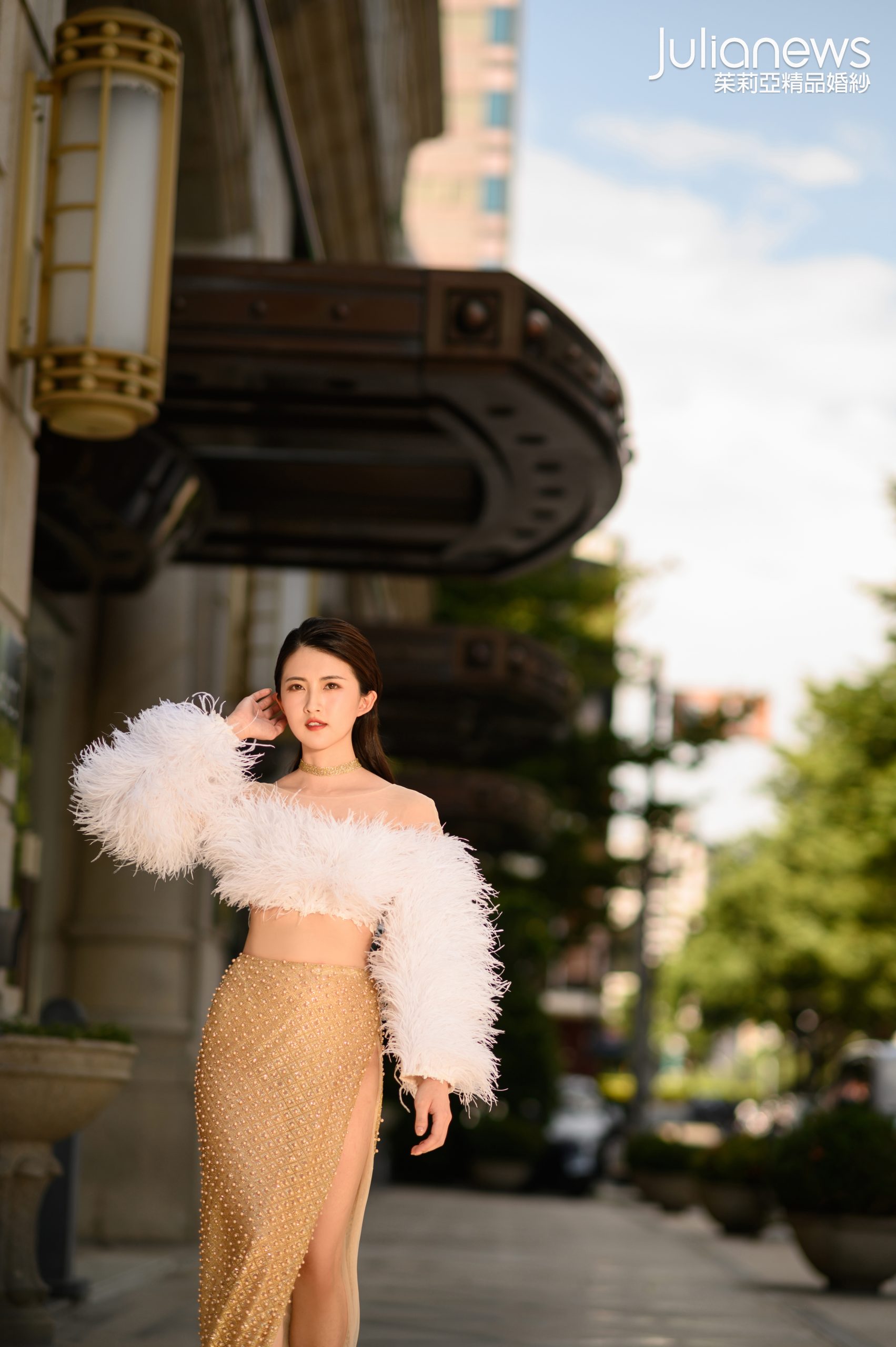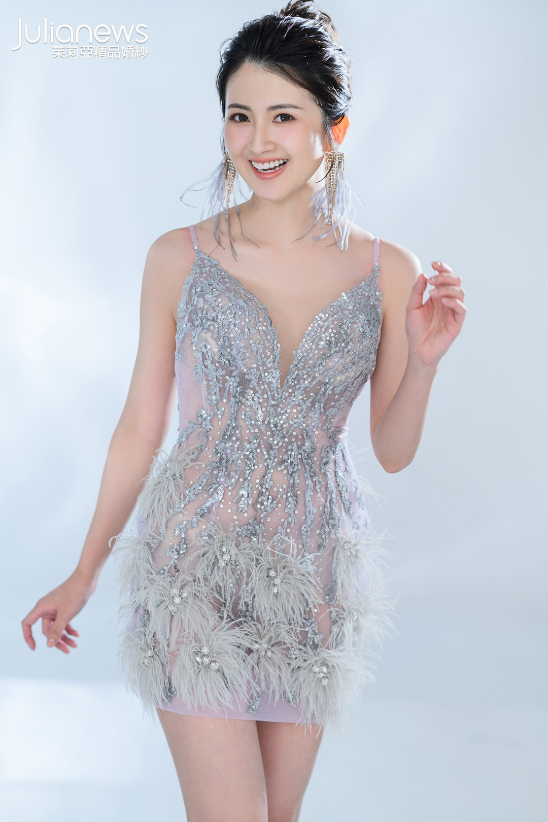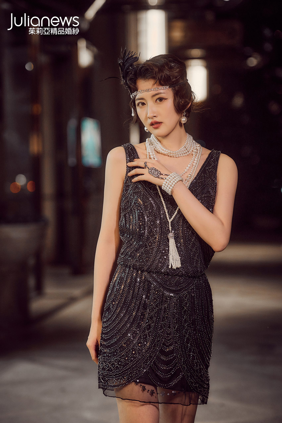 面料復古而高貴,深V領設計靈動而甜美,禮服版型修飾腿部線條,裙擺長度不多不少的描述著那一抹優雅與嫵媚,上身星星串珠點綴宛若星空,細節成就完美。